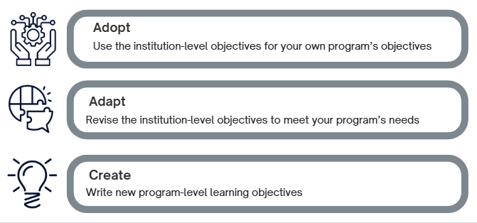 For a degree-conferring graduate program, each program can adopt the institution-level objectives for their own program's objectives, adapt the institution-level objectives to meet the program's needs, or create new program learning objectives. No institution-level grad learning objectives were defined for grad certificate; therefore, these programs will need to create learning objectives. No institution-level grad learning objectives were defined for other grad degrees; therefore, like the grad certificates, these programs will need to create learning objectives. If a program previously defined program objectives or has objectives from their accreditor that meet their needs, those can be used as their program objectives.